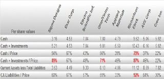 Některé z těchto společností mají velmi nízký poměr ceny a hmotného majetku (účetní hodnota, která nezahrnuje nehmotný majetek a goodwill firmy jako aktiva), blízký hodnotě 1. Spousta z nich přitom má svá aktiva připravena k okamžitému použití, a jsou tedy velmi likvidní (viz tabulka č. 1 a 2).